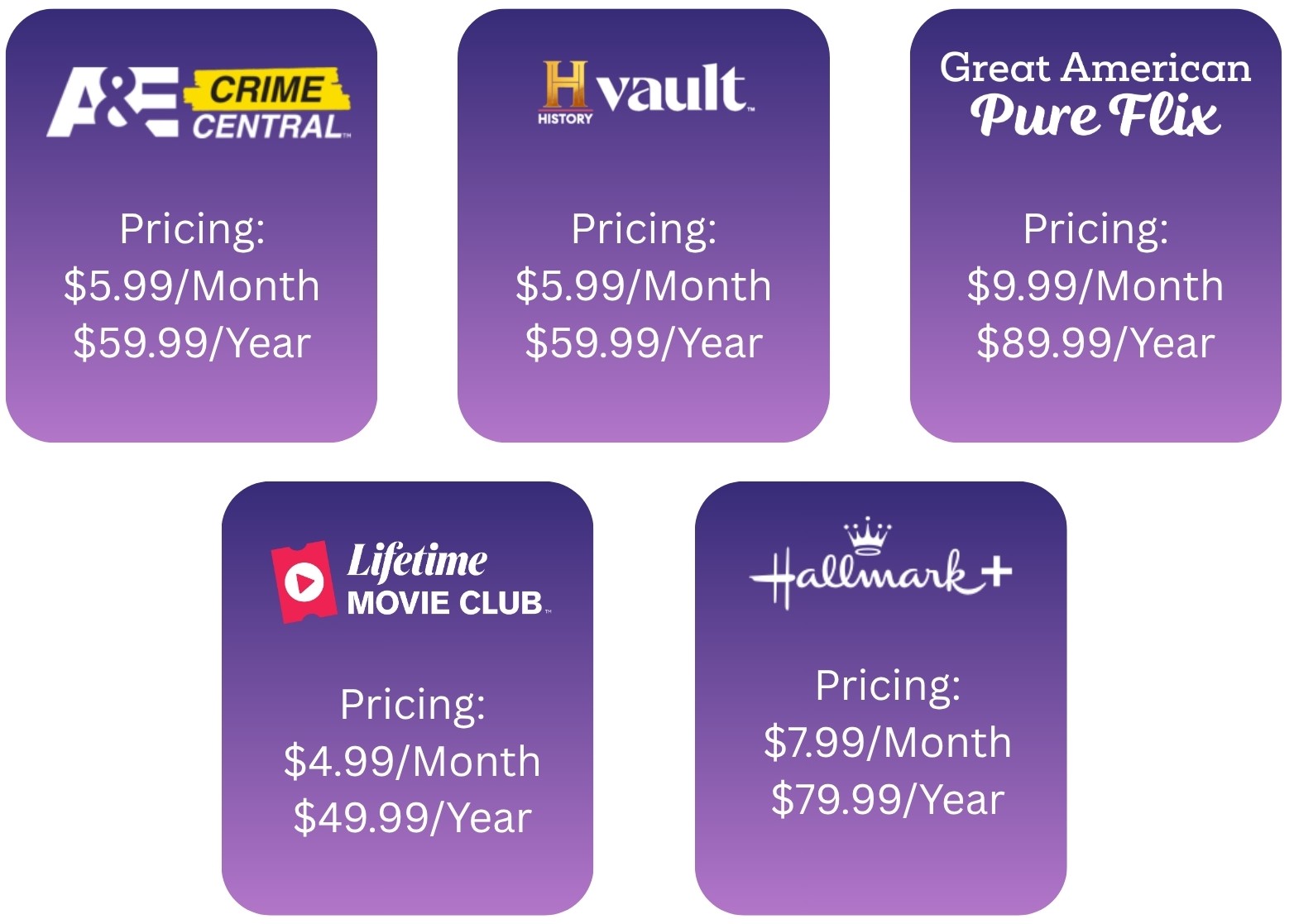 Want even more? We offer the complete Hallmark+, Lifetime Movie Club, A&E Crime Central, HISTORY Vault, and Great American Pure Flix libraries of shows and movies as individual add-on plans! This allows you to watch add-on content right within the Frndly TV app. If you are a current customer, go to your Frndly TV account at FrndlyTV.com to start a 7-day free trial!