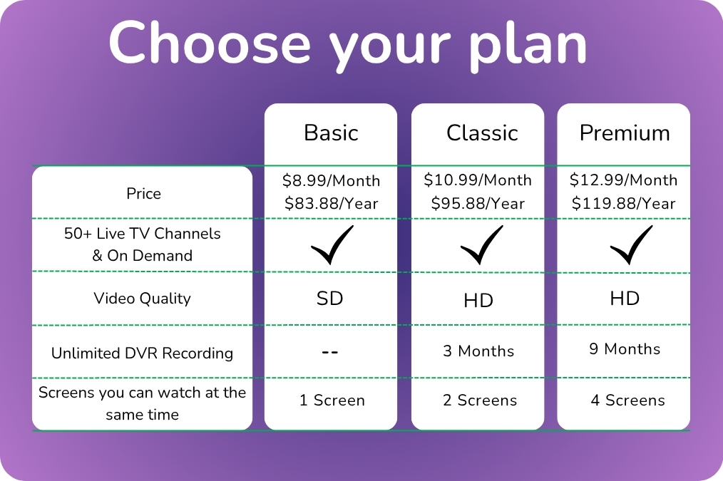 Click here to choose your Frndly TV plan and start watching! Simply select your plan and click Continue to see each plan rate.